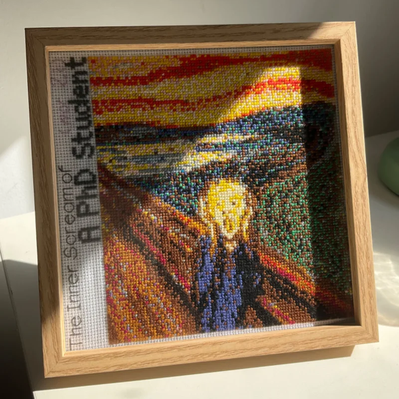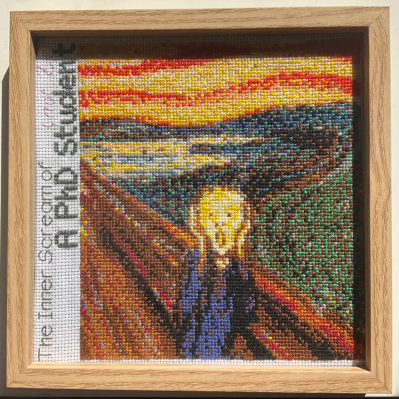 In January 2024, I wanted to stitch a famous painting but couldn't decide which. I had some friends vote between six paintings and The Scream won, because (they said) it precisely showed how PhD life felt like. I made a WeChat group with the five friends who voted for The Scream and updated them everyday with my progress.
